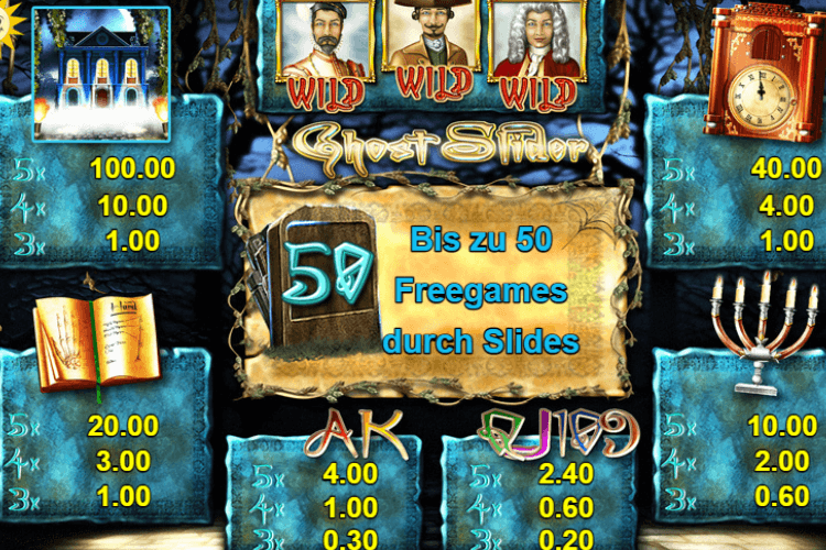 Bis zu acht Grabsteine kann das Skelett verschieben. Ab vier Grabsteinen und somit vier Re-Spins werden dann auch die Free Spins ausgelöst. Zwischen 10 und 50 gratis Drehungen sind möglich. Ghost Slider ist durchaus spannend, wenn man den Dreh einmal heraus hat.