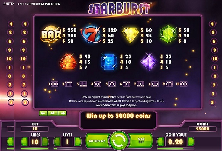 Im Jahr 2012 hat der Softwareentwickler NetEnt den berühmten Slot Starburst auf den Markt gebracht. Klassisch aufgebaut mit fünf sich drehenden Walzen und drei Reihen bietet das Automatenspiel im Online Casino viele Gewinnmöglichkeiten. Die zehn Gewinnlinien können variabel eingesetzt werden. Besonders für Einsteiger lohnt sich der Einstieg mit einem casino 10 euro einzahlung bonus, um den beliebten Slot mit zusätzlichem Spielguthaben zu testen.